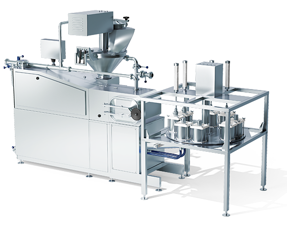 Când procesul de opărire-frământare a pastei filate este terminat, aceasta este transferată spre zona de formare. Această zonă conține douășnecuri care împing produsul spre zona de umplere. în această zonă există un număr de forme de umplere, având forma dorită : cilindrică, rectangulară. Pe măsură ce produsul este împins în aceste forme, pistonul din forme se ridică până la atingerea nivelului reglat. în acest moment masa se rotește aducând o formă nouă la umplere, iar forma umplută ajunge în mod automat la gura de descărcare unde bucata de brânză este evacuată automat.